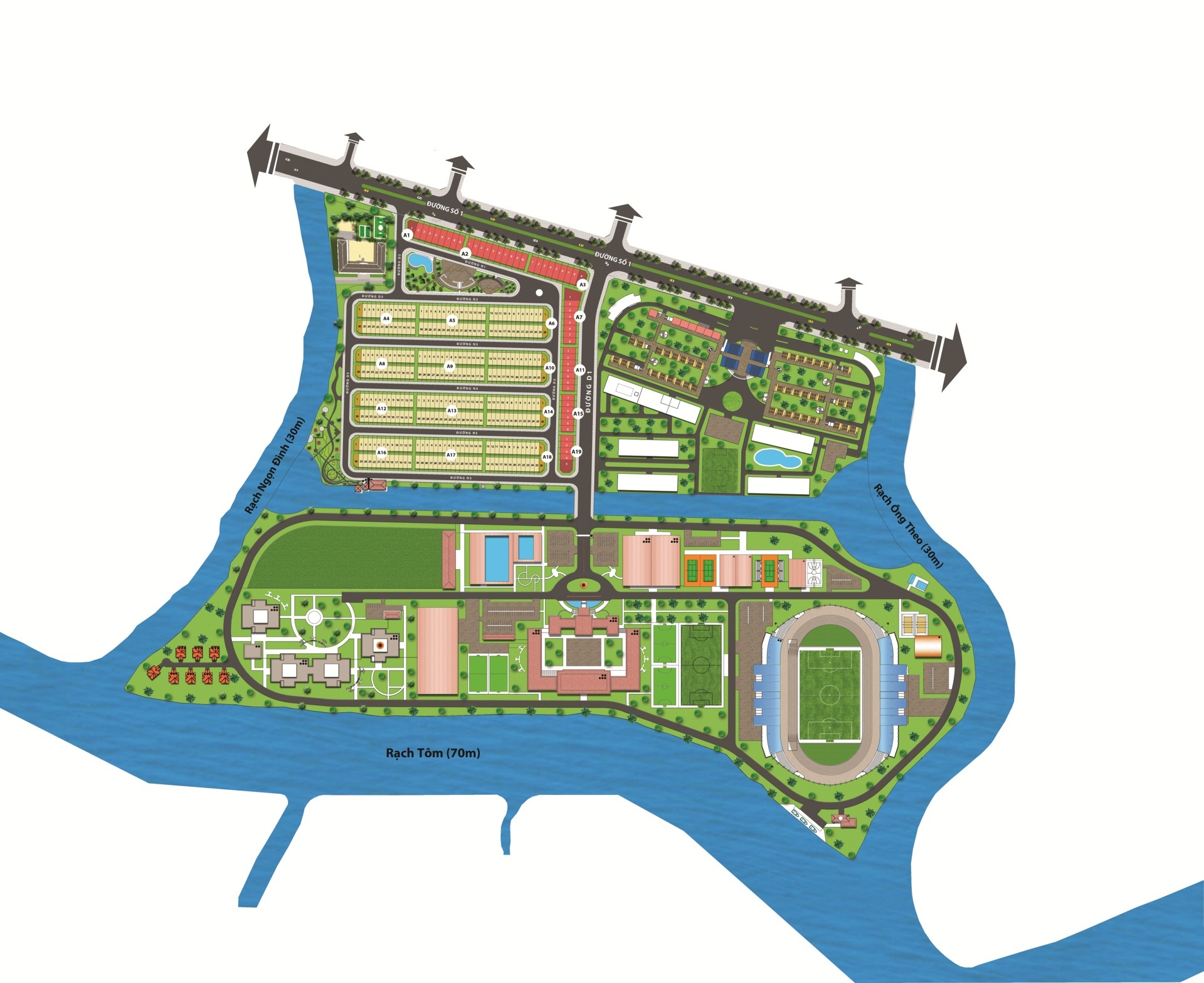 Một vị trí lý tưởng, ngay mặt tiền đường số 1. Với 3 mặt tiếp giáp rạch là Rạch Tôm, Rạch Ông Theo và Rạch Ngọc Đình, sông nước hữu tình.