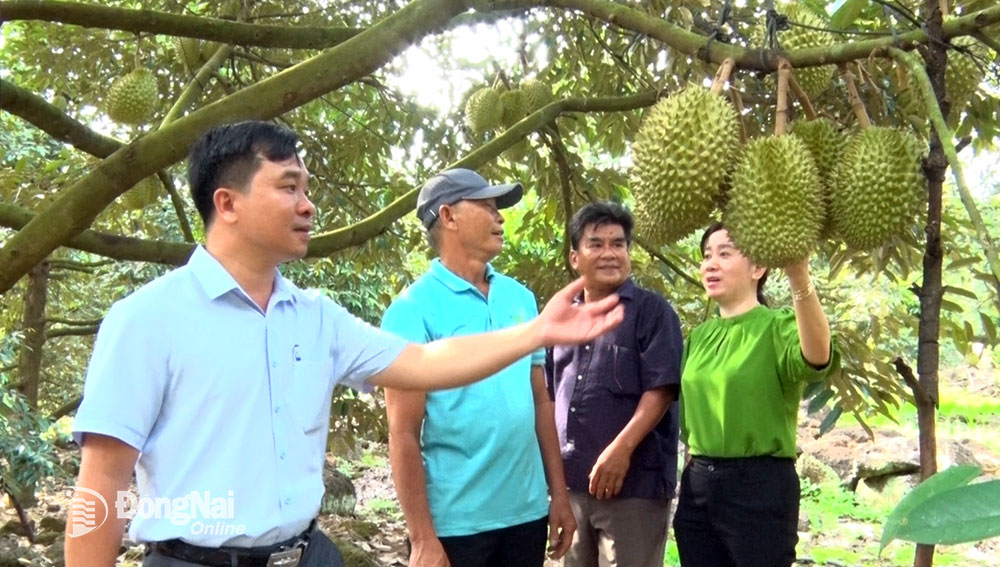 | Cán bộ P.Bàu Sen (TP.Long Khánh) đến thăm các hộ nông dân trồng sầu riêng tại vùng sỏi đá Núi Đỏ. Ảnh: AN NHƠN |