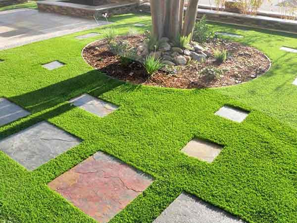 Cỏ được trồng xen kẽ giữa các phiến đá mang đến một không gian xanh sạch đẹp.