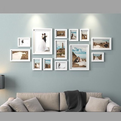 Những khung ảnh gia đình màu trắng nhỏ, to được sắp xếp hợp lý