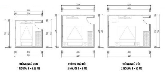 Với diện tích phòng ngủ trung bình cho 2 người là: 12m2.