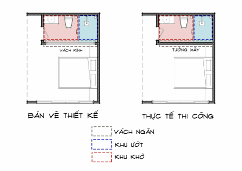 Trường hợp khác là một gia đình ở Buôn Mê Thuột (Đắk Lắk) đã tự thay đổi vị trí bồn cầu và khu tắm. Vì không rành đọc bản vẽ nên đến khi hoàn thiện, anh Thanh mới thấy thiết kế không giống những gì mình hình dung. Anh muốn đặt bồn cầu vào nơi sâu nhất của nhà vệ sinh. Vì vậy anh yêu cầu thợ đổi khu ướt và khô, dời vị trí bồn cầu vào trong cùng.