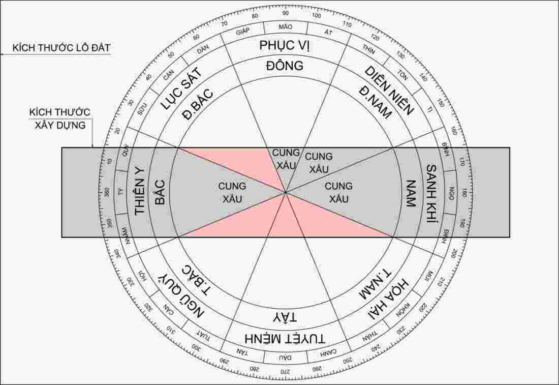 - Nếu điều kiện lô đất rộng, kích thước chiều dài, chiều rộng cần tương quan phù hợp để đảm bảo dễ dàng bố trí công năng thỏa mãn các trường phái phong thủy Hình Thế và Lí Khí. Ví dụ: Nếu nhà hẹp, dài, phía trước và phía sau nhà là cung xấu, thì rất khó thiết kế, vì cung xấu ôm trọn gần hết diện tích căn nhà. Vậy nên trong trường hợp này, phải chọn kích thước có chiều ngang lớn, chiều sâu ngắn hơn.