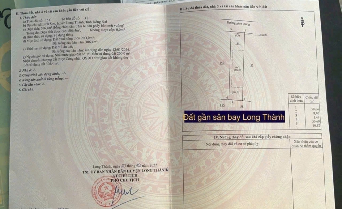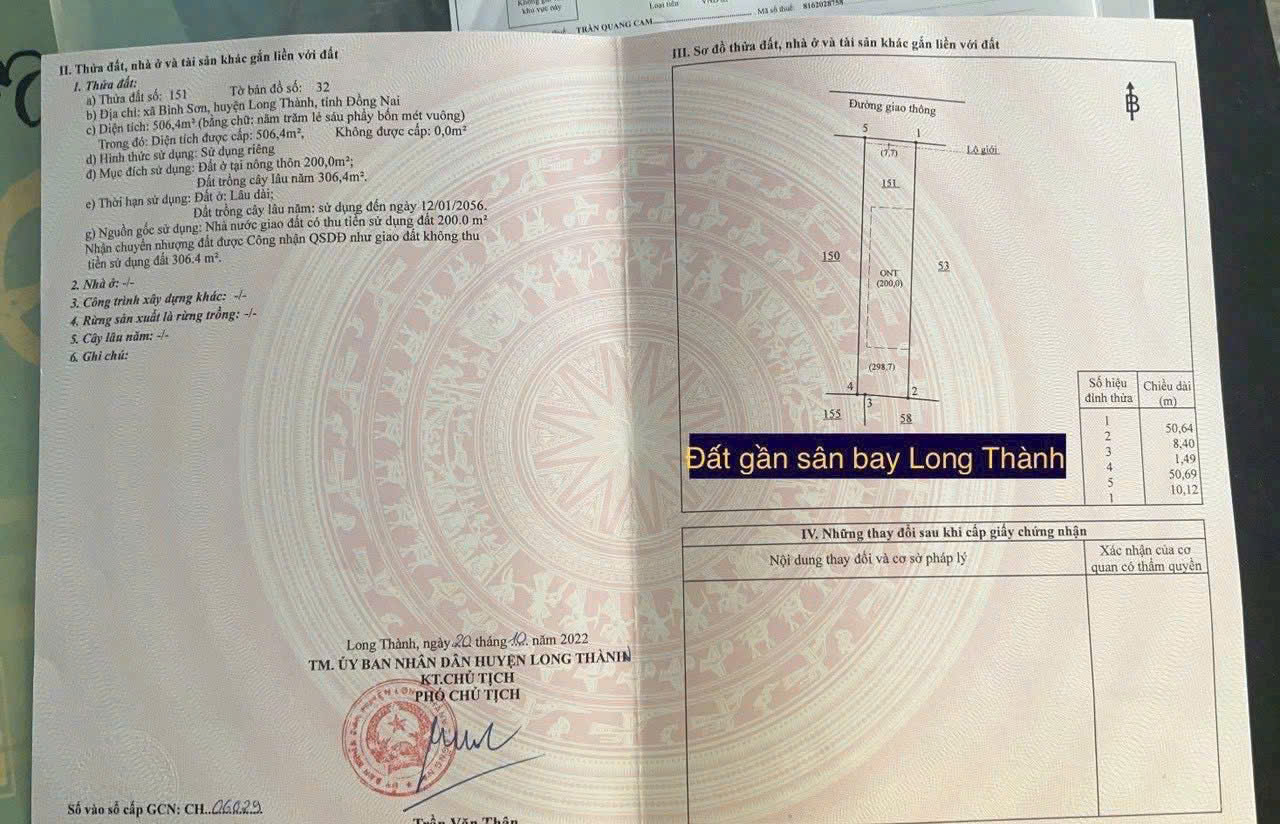 BÁN 506m2 có sẵn Đất thổ cư 200m2 ONT vị trí chiến lược gần Sân bay Quốc tế Long Thành