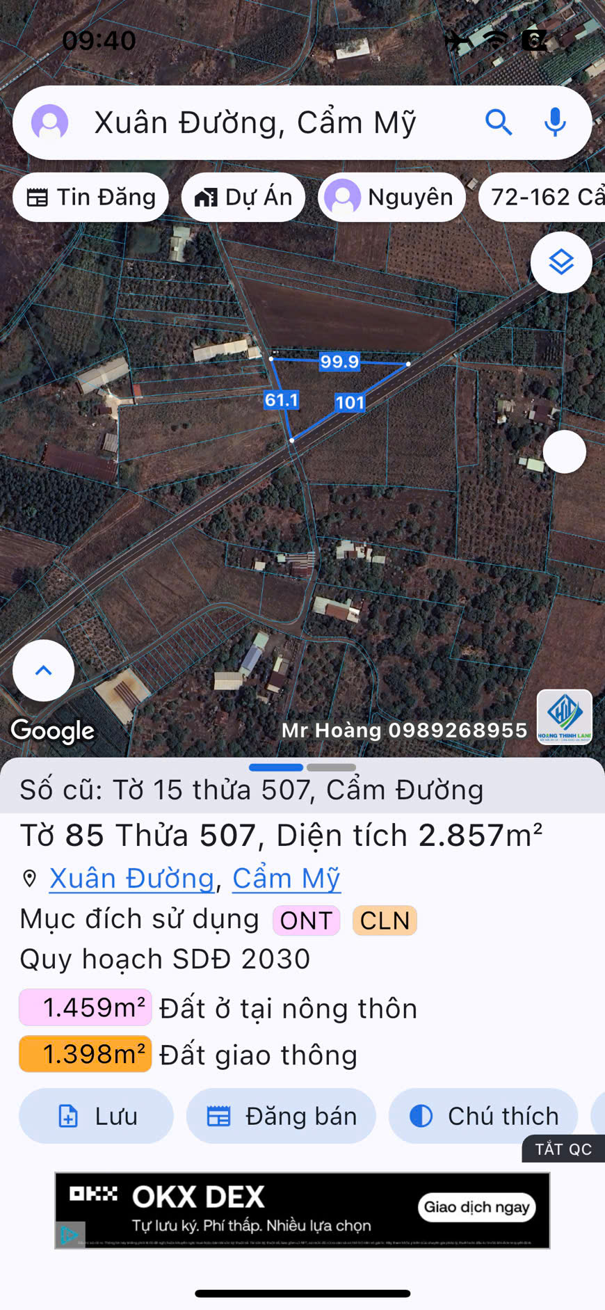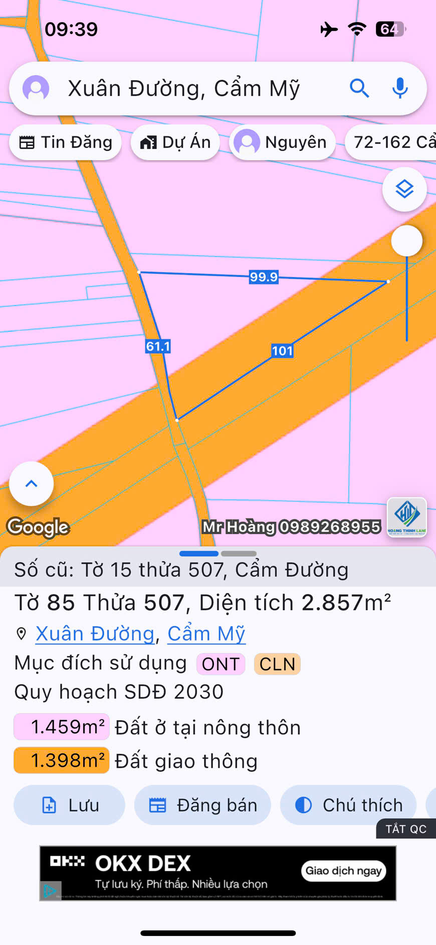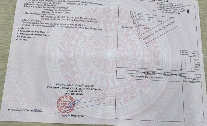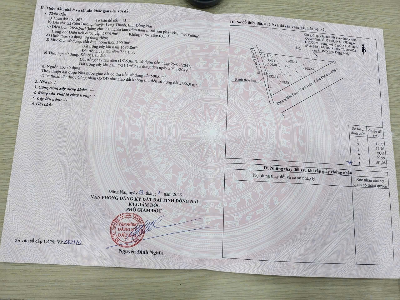 - Diện tích: 2.856,9m² (trong đó có sẵn 500m² thổ cư ONT)